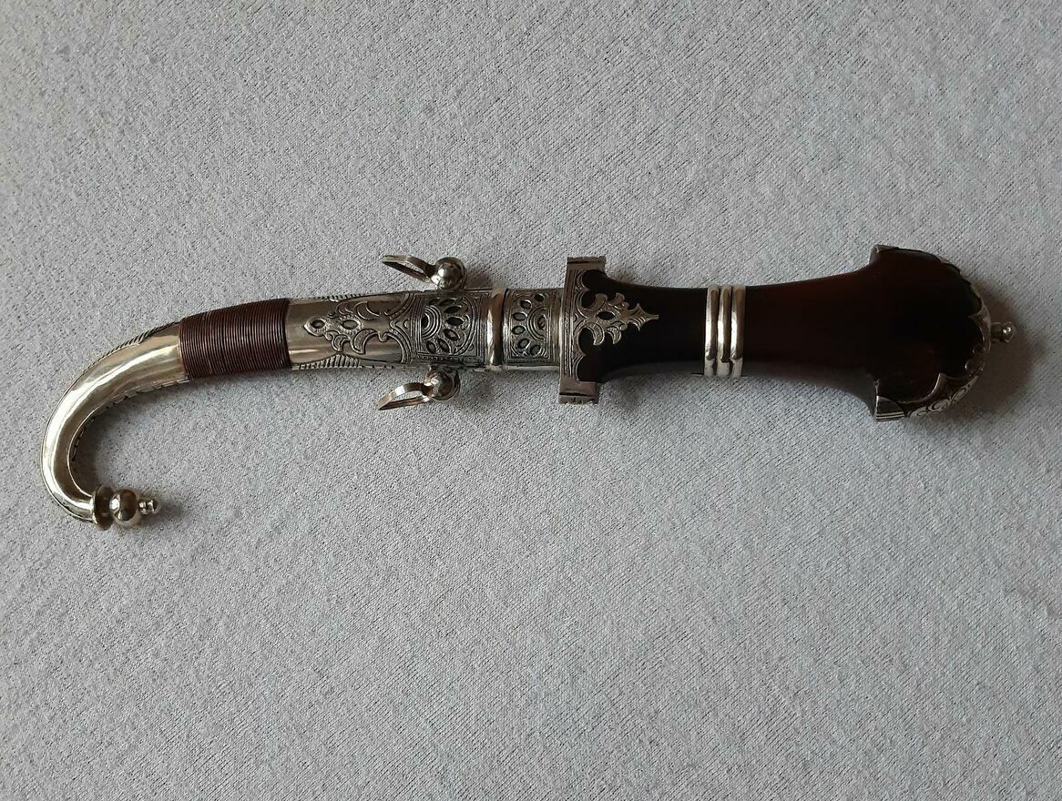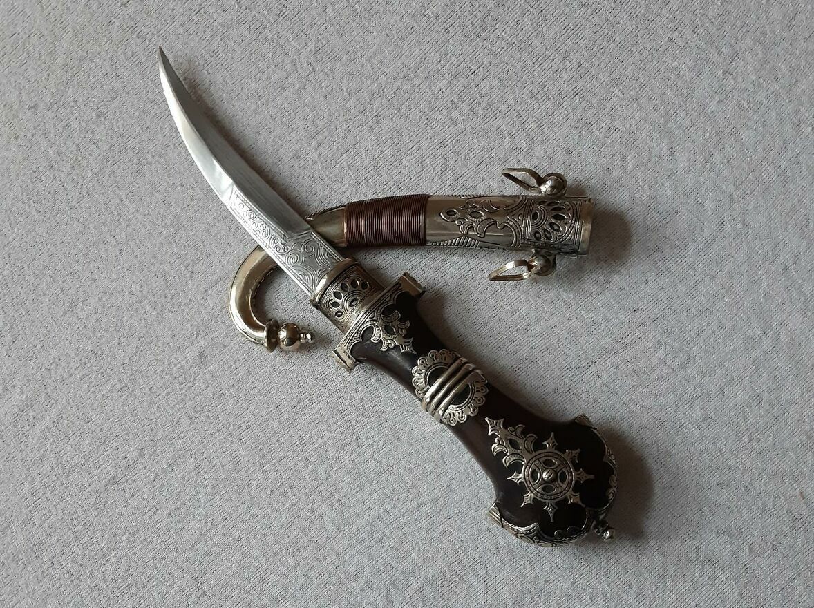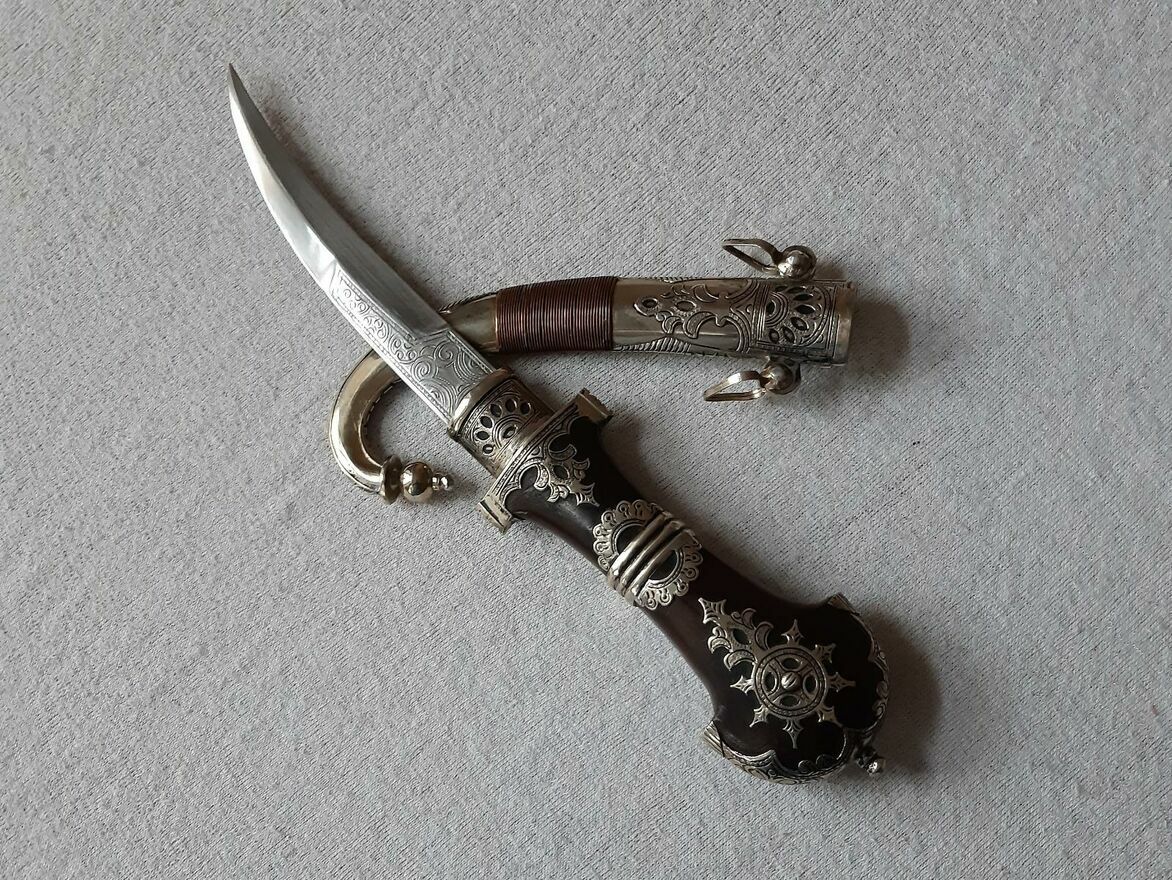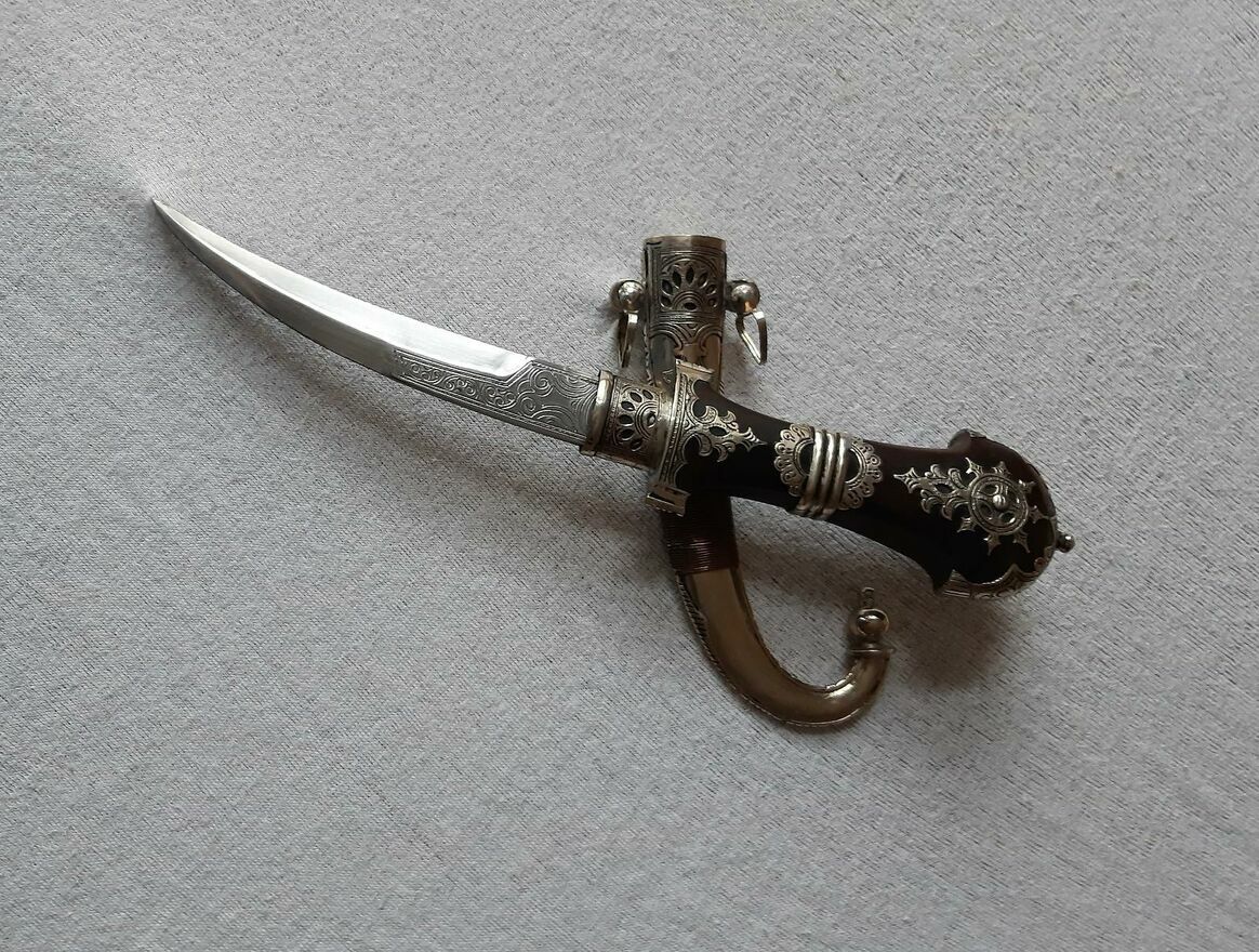Ostrze: stalowe prezentowany przedmiot to tradycyjny nóż arabskie często identyfikowany jako dżambia charakterystyka posiada krótkoobsadzone i zakrzywioną główkę zastosowania jest to broń bojowa oraz ceremonialna popularna w krajach arabskich turcja persja i indiach pochwa jest znaczenia dłuższa od ostrza wygieta i bogato dekorowana