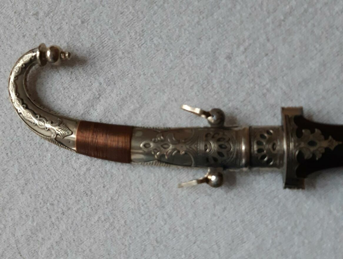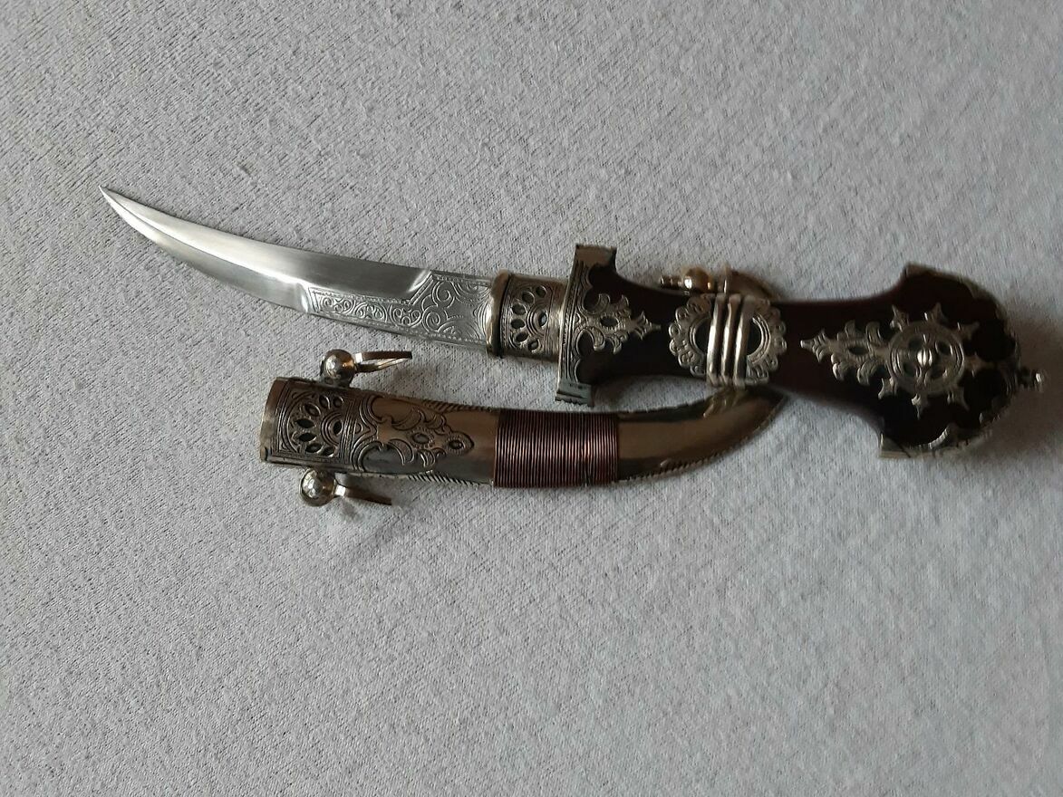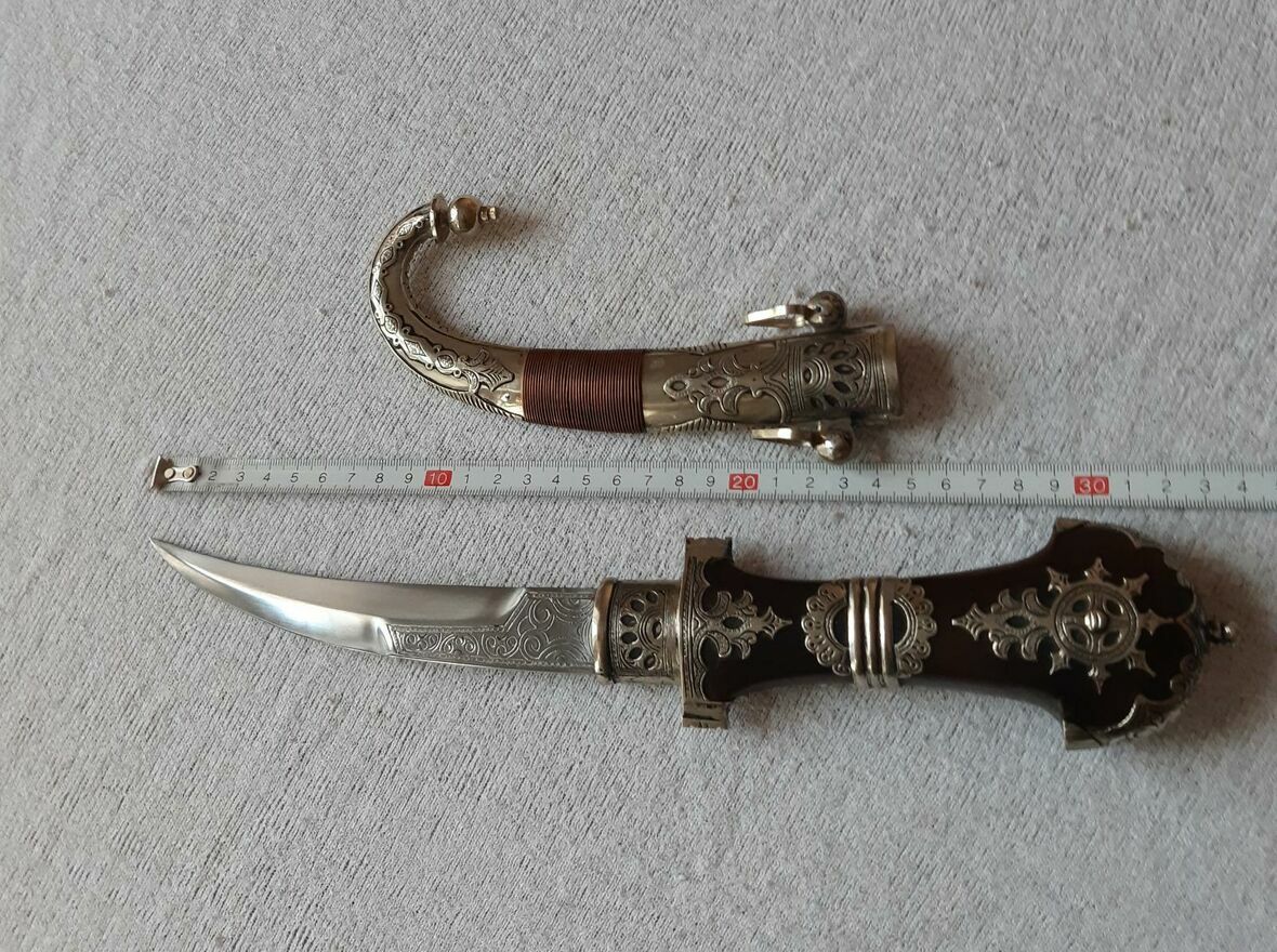 Orientalny sztylet z pochwą, Nie replika orginalnerę ,kojeść z egzotycznego woodna bogato zbodionami metalowymi aplikacjami, podobnie jak pochwa - patrz zdjęcie. Metalowe zawieszające, pozujące, mokowanie do pasa lub noszenie zawieszone. Precyzyjne rękodzieło. Miska jest w całości metalowa i ozdobiona owiniętym drutem miedzianym.Długość całkowita: 33 cm